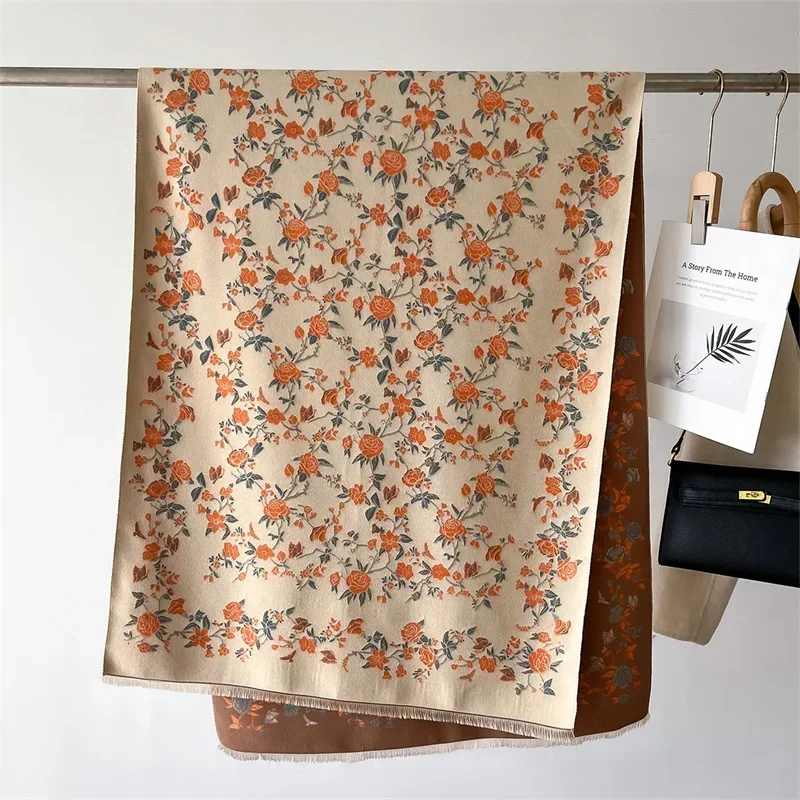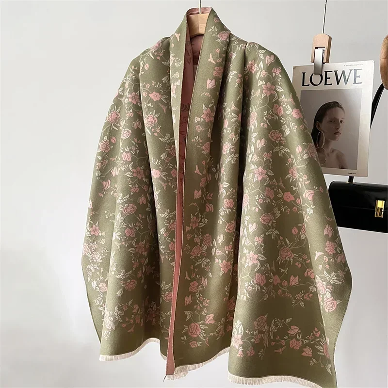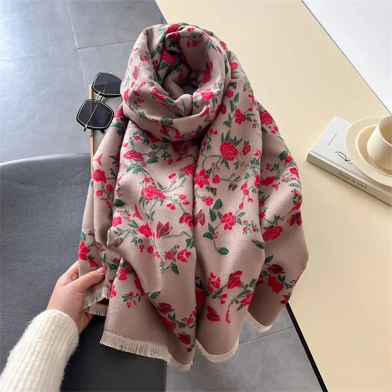 وشاح كشمير فاخر للنساء ، شال دافئ ، بطانية شتوية ، لفافات بطبعة زهور ، باشمينا ، عباءة سفر ، وشاح غير رسمي
